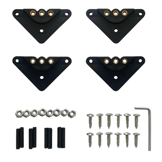 The AUKTools ACCU Lift Corner Levelling Pads are the best way to an AUKTools ACCU Lift to your home-made router table or to adapt your exisiting Kreg™ Router Table Top. The Levelling Pads eliminate the requirement for a supporting ledge and feature an under table mounted design that includes eight adjustable points of contact and four corner bolt down points. For router table tops up to 38mm thick with 19mm corner radius on the plate opening.