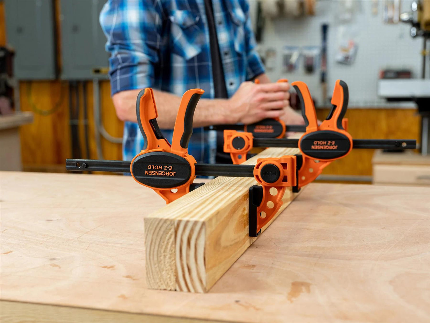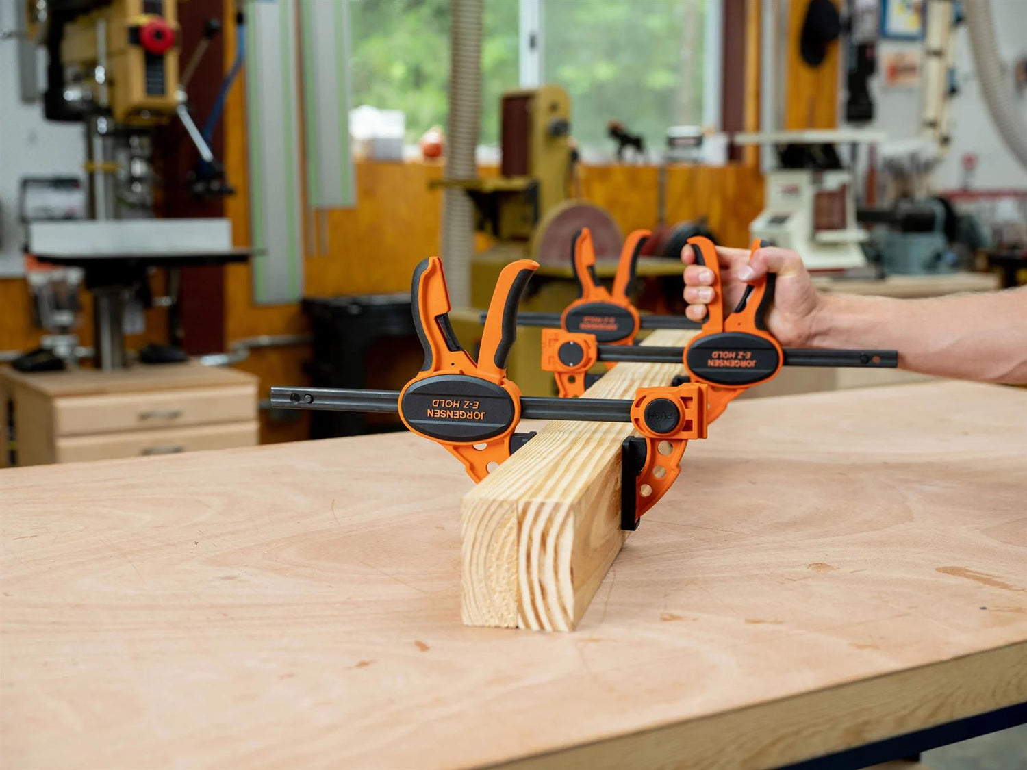 Jorgensen’s unique E-Z HOLD bar clamps offer more clamping pressure than standard squeeze clamps, with easy one-handed clamping that can quickly be converted to spreader clamps. The contoured comfort grip and quick-release lever make it simple to get a firm grasp, and the exclusive patented feature lets you join two clamps together to create a clamp with more than double the opening capacity of a single clamp. Deep reach 86mm pads help protect your work from any marks or scuffs when using utilizing the 300 lbs of clamping force. A very capable all-around workshop clamp and spreader which when needed can be used in pairs to double the capacity.