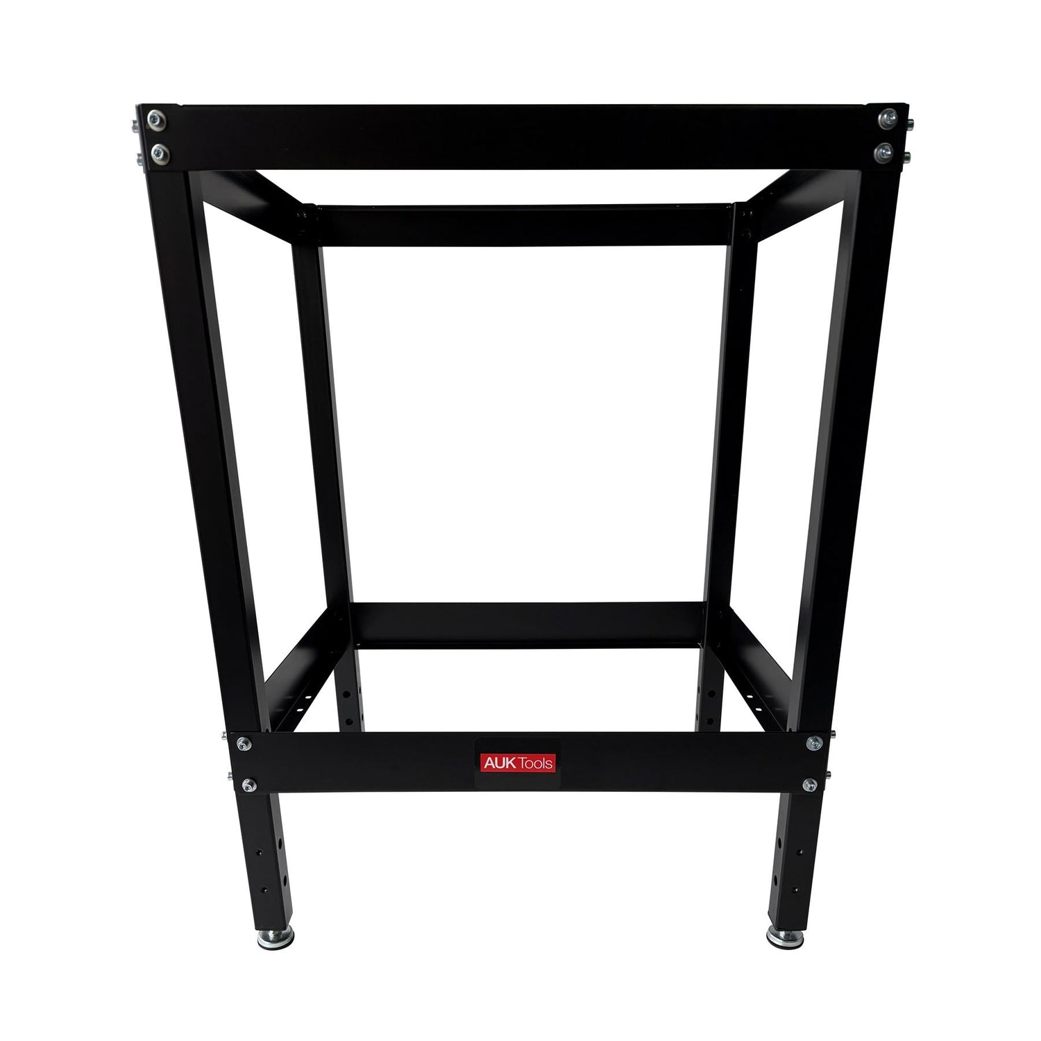 Our AUKTools heavy duty router table stand is made with sturdy square section steel legs, steel angle cross braces all powder coated in black for long lasting durability. The pre-installed welded steel nuts make assembly quick and easy using the supplied hex socket cap screws. The anti-slip non marking feet are height adjustable for levelling on un even floors. Fits all JessEm router table tops including the Mast-R-Lift Excel II table. Suitable for use with router table tops of 800 x 600mm, 32" x 24" or larger where a quality robust table is employed.