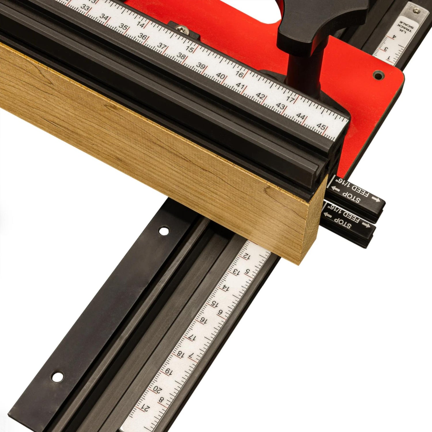 JessEm started the design using a red phenolic base for a solid platform but also giving us that 100% flat surface every woodworker wants. They precision machined the 6061 aluminium extrusion and finished the parts with a black anodised finish. Instead of the plastic 'high boy' knobs seen on all other fences, they went one step further and machined the 'high boy' knobs out of 6061 aluminium. The entire fence is constructed using stainless steel hardware and other components to give it that beautiful look that will last a lifetime.