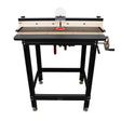 This heavy-duty, sturdy steel router stand is black powder-coated for excellent durability. Manufactured with tubular steel legs and flanged steel cross braces for a strong and rigid table support system - for extra versatility, you can even build an interior shelf across the flanged braces if you like.