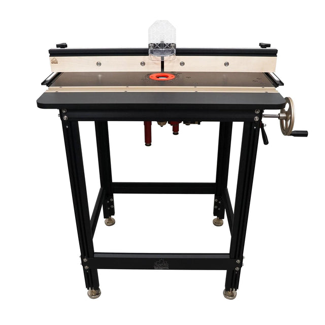 The ultimate in quality router systems for the discerning customer looking for excellent durability and precision without the use of an additional router plate. The 19mm solid phenolic top will not deform and is impenetrable to moisture, thus preventing swelling, rusting and other water damage. The sidewinder carriage wheel provides convenient height adjustment whilst not interfering with the fence mechanism, feather boards or work-piece. The slick, low-profile lift design allows easy router cutter changing from above the table eliminating the need for any under-table adjustments.