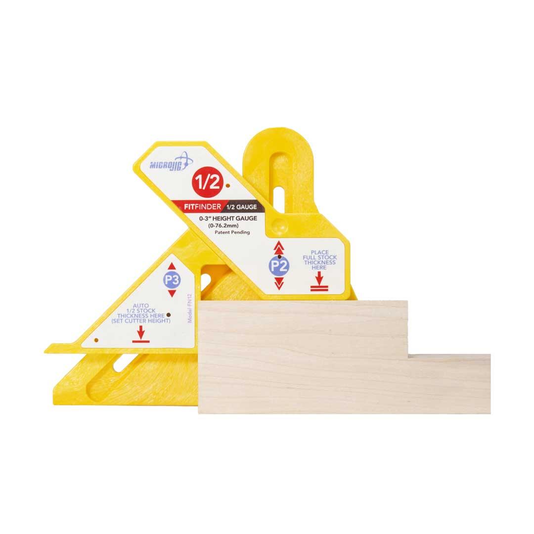 The Micro Jig FitFinder 1/2 Gauge is one of the fastest and most accurate ways to find the 1/2 way point in your work material up to 75mm (3") thick. Find the centre point of your material in seconds, automatically, and without maths, measuring, or guesswork. Set the work material under the FitFinder thickness gauge, and the sliding depth gauge automatically slides down to the exact 1/2 way mark of your work material.