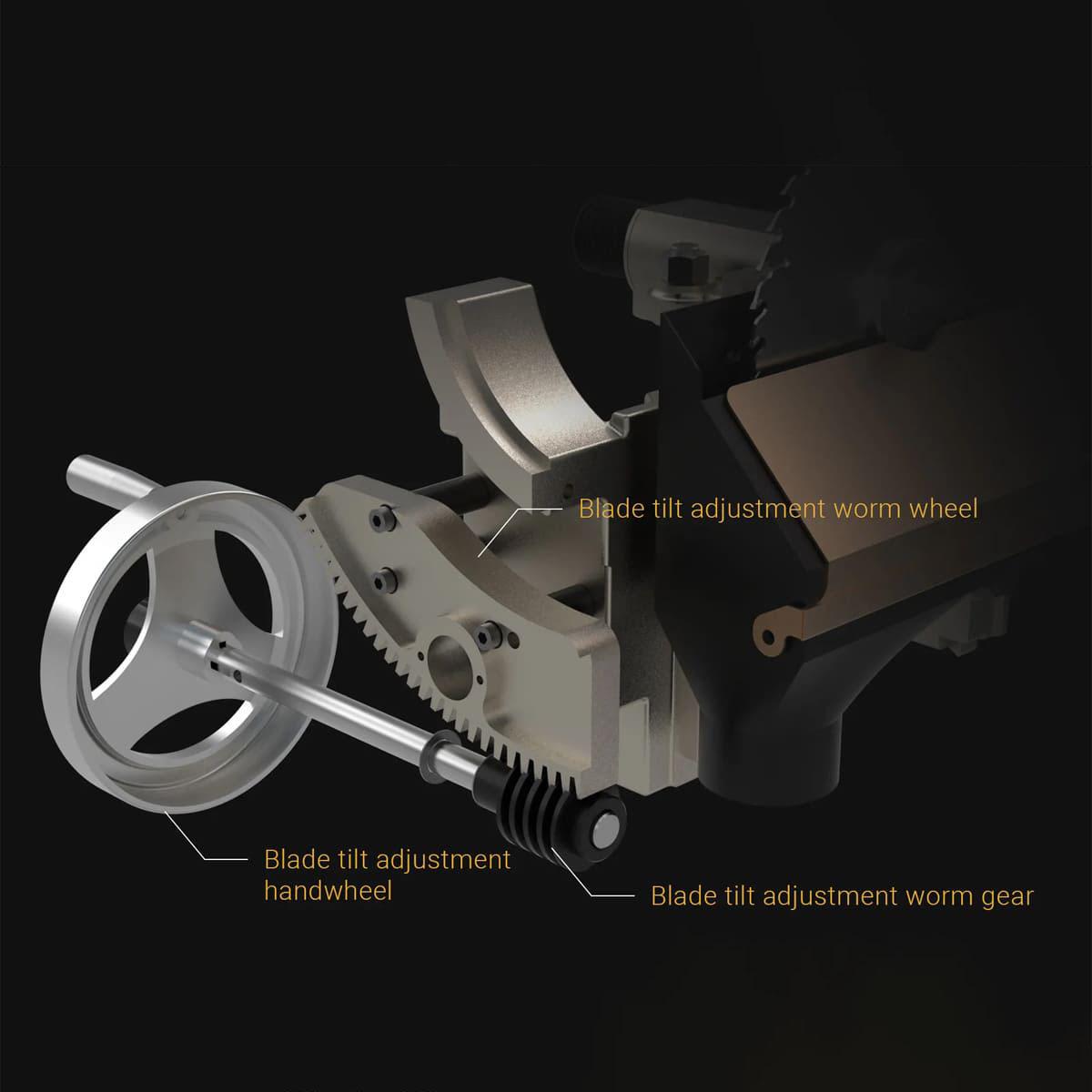 The blade is elevated by a heavy-duty dovetail trunnion system which provides smoothness and greater cutting accuracy, with less vibration. The 45-degree left-leaning blade tilt angle is adjusted by a worm gear trunnion system with massive cast iron block making the blade tilting smoother and more accurate.
