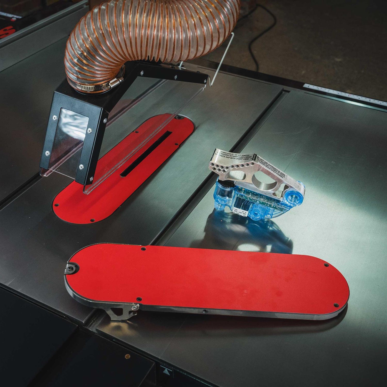 The DADO Essential configurations include the add-ons and accessories needed to use the saw under EU/UK rules and includes the above mentioned Floating Overarm Dust Collection Guard but also including the Secured Dado Lock Down Zero-Clearance Insert and Table Saw Brake Cartridge For 203mm/8" Dado sets.
