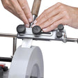 The jig's construction also makes it possible to position and sharpen tapered chisels, e.g. Japanese chisels. The safety stops keep the jig securely on the Universal Support and prevent the tool from sliding off the grindstone, so there is no risk that you will hurt your fingers when sharpening. The jig fits wood chisels and plane irons up to 77 mm (3") width.