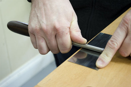 The Melbourne Tool Company carbon steel scraper blade is ground at 45 degrees on both edges and is easy to prepare for work by simply turning a small burr. The blade can be reversed when one edge dulls, while the upper sharp edge is tucked safely behind the body casting, meaning you won't accidentally cut yourself!