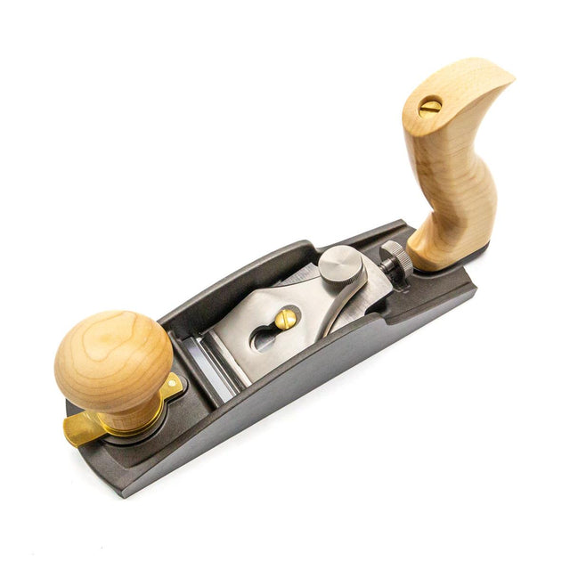 The Melbourne Tool Company Low Angle Smoothing Plane can plane any kind of wood yet remains an uncomplicated tool. The minimalistic design makes it easy to disassemble for maintenance and reassemble for work. The adjustment knobs and wheels are accessible and feature a very smooth action. The blades depth of cut is adjusted by simply turning the depth and lateral adjustment wheel. Slide the adjustment wheel side to side to skew the blade left and right.