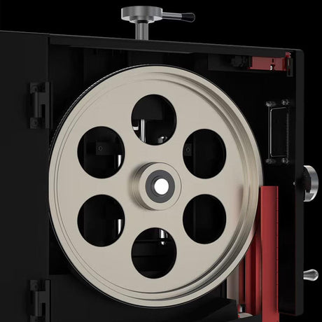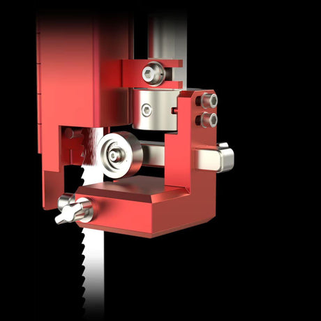 Double-bearing blade guides sit each side of the blade, adjusted on a cam system and locked with a metal wingnut. At the rear of the blade a large diameter thrust wheel provides support to the blade during the cut. The same blade guide system is also fitted below the table.